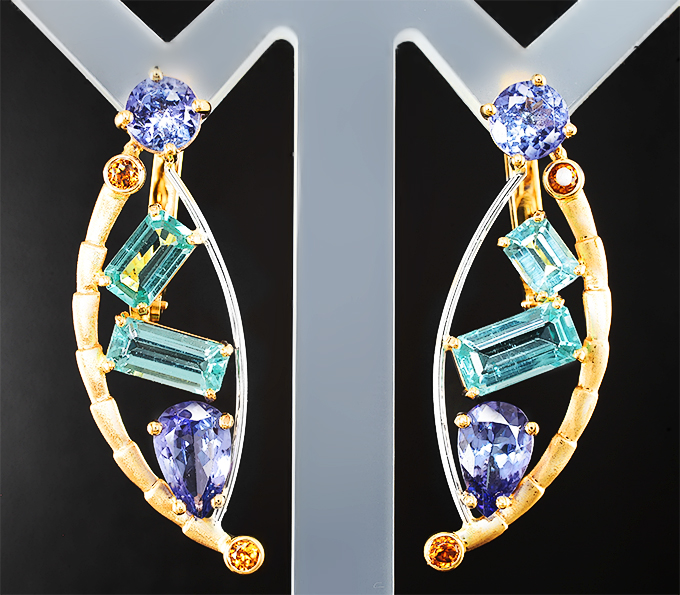 Вашему вниманию предлагаются серьги из желтого и белого золота 585 пробы с «неоновыми» апатитами, танзанитами и цирконами! Диаметр дополнительной инкрустации 2,5 мм. Площадка серег 38 х 13 мм. Вес пары 7,5 г. Ниже приводятся ювелирные характеристики вставок.