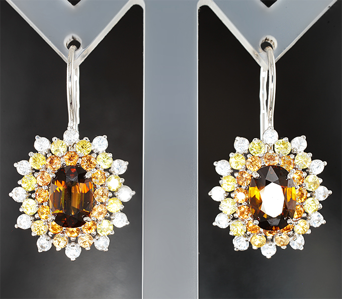Вашему вниманию предлагаются серьги из белого золота 585 пробы со сфенами и разноцветными сапфирами! Диаметр дополнительной инкрустации 2 мм. Размеры серег с петлей 31 х 18 мм. Вес пары 6,02 г. Ниже приводятся ювелирные характеристики вставок.