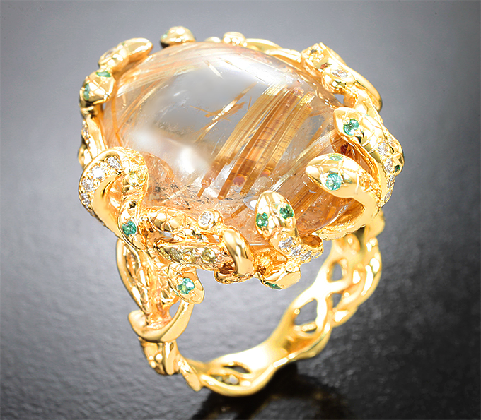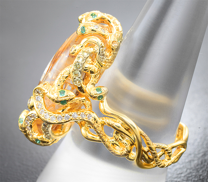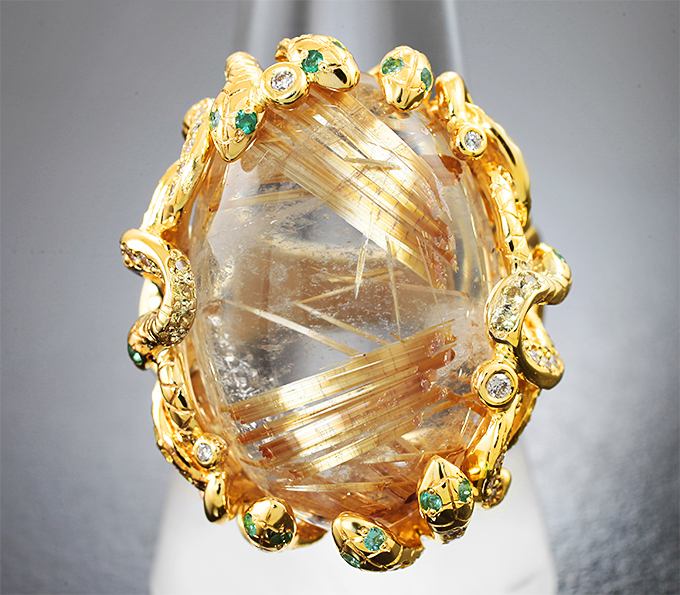 Кольцо с топовым рутиловым кварцем 23,78 карата, желтыми сапфирами, изумрудами и бриллиантами