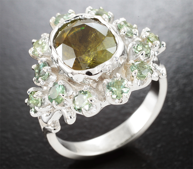 Кольцо с полихромным сфеном с рутилом 3,13 карата и зелеными сапфирами