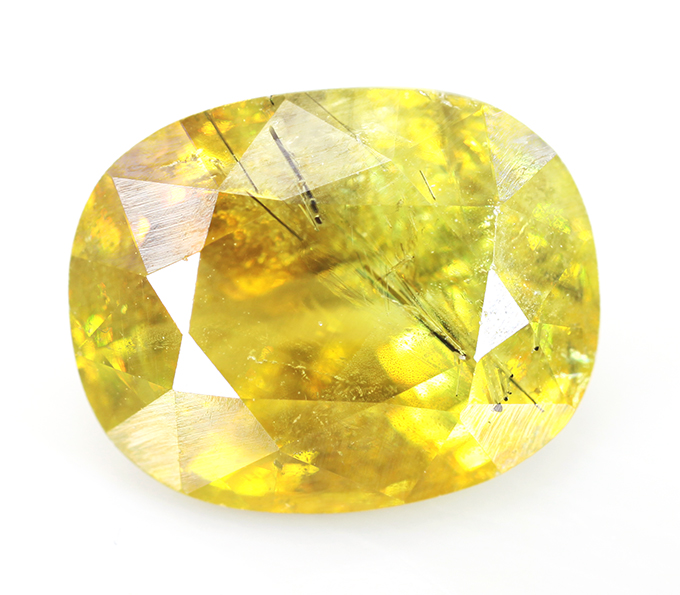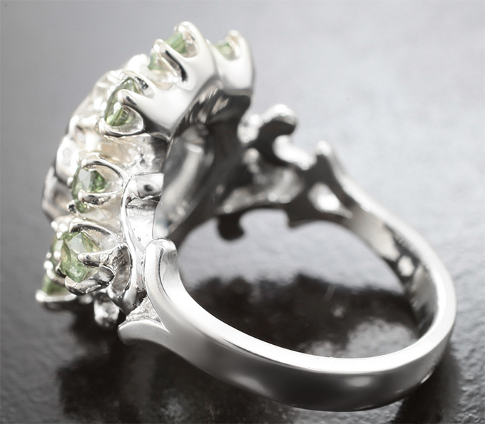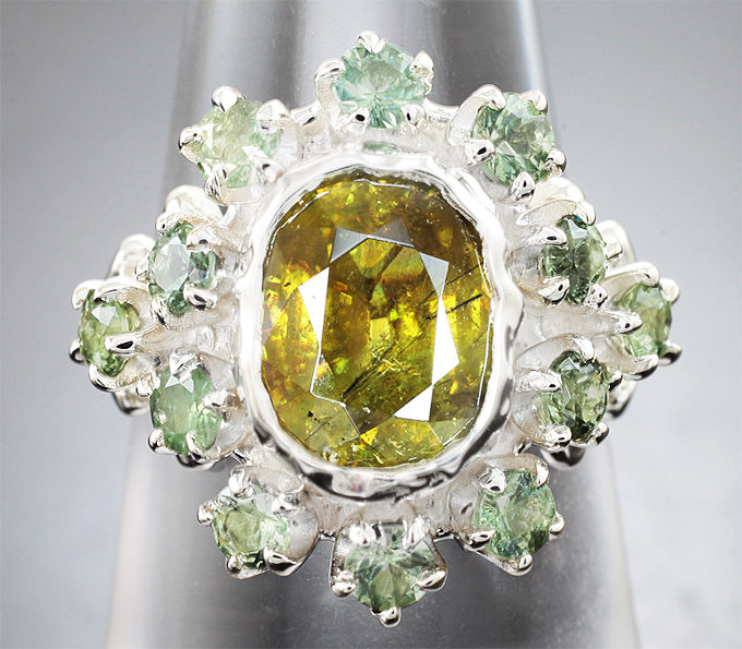 Вашему вниманию предлагается кольцо из стерлингового серебра (925 проба) c полихромным сфеном с рутилом и зелеными сапфирами! Диаметр дополнительной инкрустации 3 мм. Площадка 20 х 19 мм, высота 6 мм. Вес изделия 6,94 г. Размер 16. Ниже приводятся ювелирные характеристики центральной вставки.