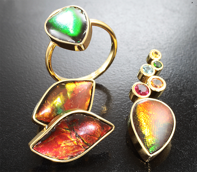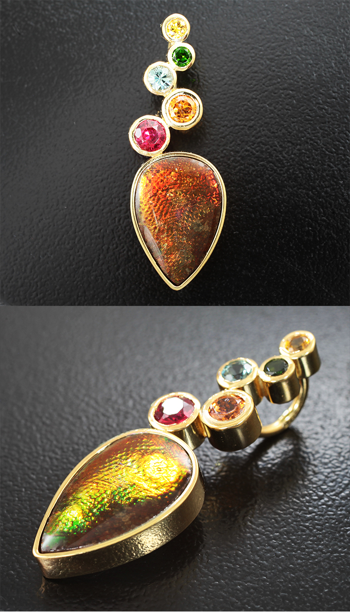Комплект с аммолитами аммонита 15,58 карата, рубиновой шпинелью, цитрином, диопсидом, васильковым и желтым сапфиром