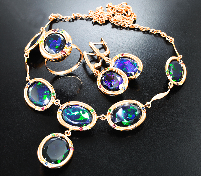 Вашему вниманию предлагается комплект (колье + кольцо + серьги) из красного золота 585 пробы с ограненными черными опалами, разноцветными сапфирами и цаворитами гранатами! Размеры опалов 14 х 10 мм. Диаметр дополнительной инкрустации 1,5 мм и 2,3 мм. Вес комплекта 35,91 г.