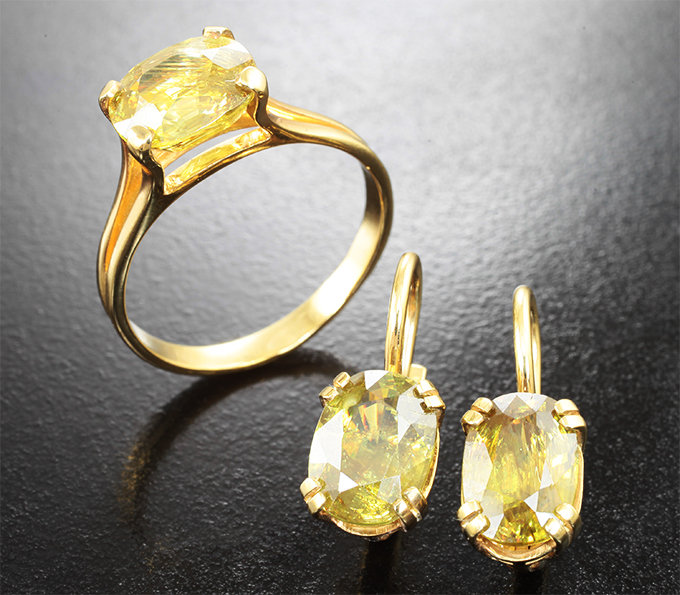 Вашему вниманию предлагается комплект (кольцо + серьги) из стерлингового серебра (925 проба) со сфенами! Изделия позолочены. Вес комплекта 6,84 г.