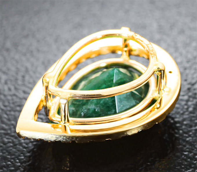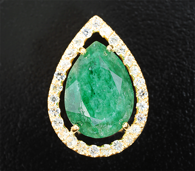 Вашему вниманию предлагается кулон из желтого золота 585 пробы с уральским изумрудом и бесцветными цирконами! Диаметр дополнительной инкрустации 1,5 мм. Площадка 19 х 13 мм. Вес изделия 2,19 г. Ниже приводятся ювелирные характеристики центральной вставки.