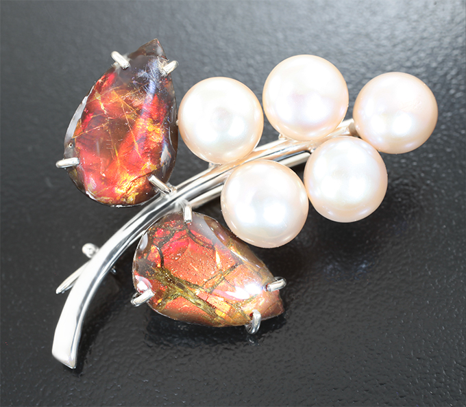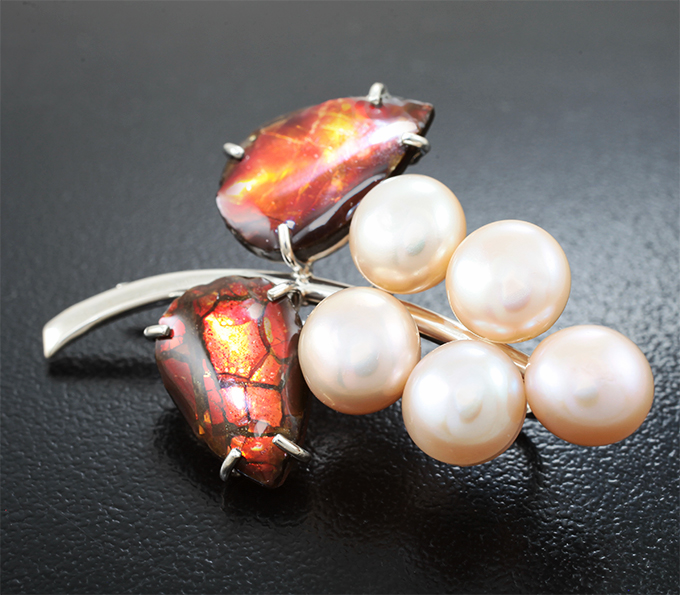 Брошь с морским жемчугом 15,16 карата и аммолитом аммонита 10,28 карата