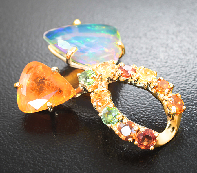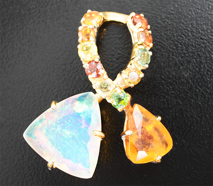 Кулон с оранжевым содалитом 3,05 карата, ограненным эфиопским опалом 5,54 карата и разноцветными сапфирами