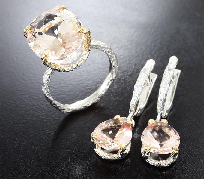 Вашему вниманию предлагается комплект (кольцо + серьги) из текстурного стерлингового серебра (925 проба) с морганитами и лейкосапфирами! Диаметр дополнительной инкрустации 2 мм. Изделия частично позолочены. Вес комплекта 12,57 г.