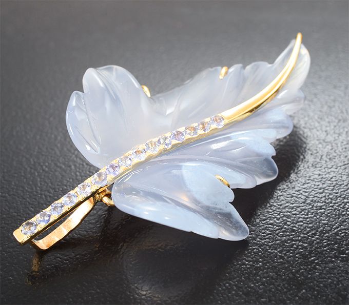 Брошь/кулон с полупрозрачным нежно-сиреневым резным халцедоном 26,21 карата и танзанитами