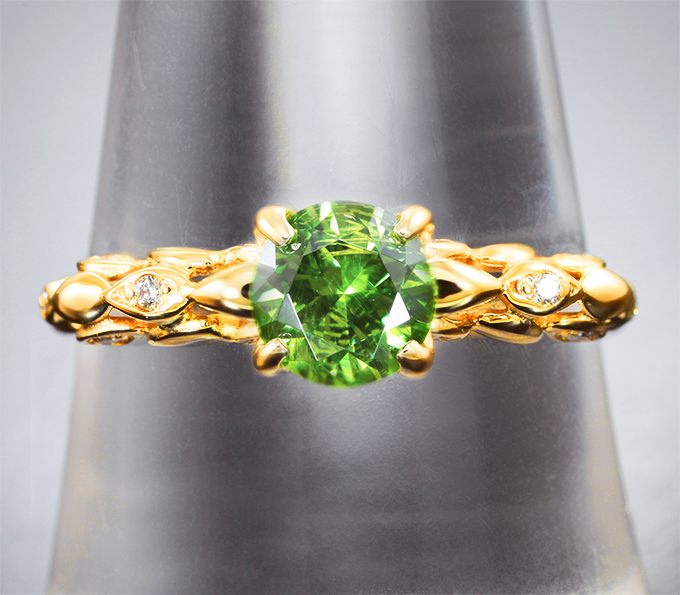 Кольцо с уральским демантоидом топовой огранки 0,74 карата и бриллиантами