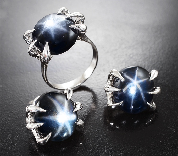 Вашему вниманию предлагается комплект (кольцо + серьги) из белого золота 585 пробы со звездчатыми сапфирами 46,93 карата! Размеры вставок 15 х 13 мм и 16 х 14 мм. Вес комплекта 22,1 г.