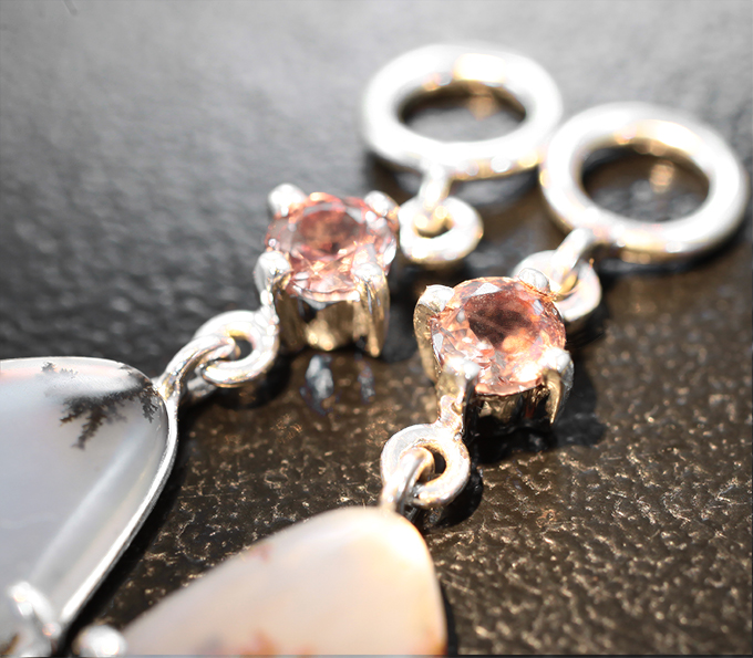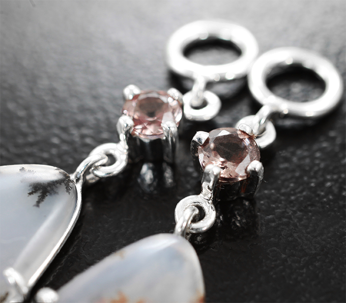 Вашему вниманию предлагаются подвесы для серег из стерлингового серебра (925 проба) с агатом с включениями дендритов и гранатами со сменой цвета! Площадка серег 49 х 15 мм. Вес пары 5 г. Ниже приводятся ювелирные характеристики вставок.