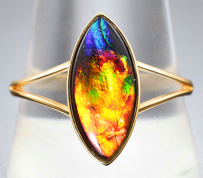 Вашему вниманию предлагается кольцо из желтого золота 585 пробы c аммолитом аммонита! Площадка 17 х 8 мм, высота 3 мм. Вес изделия 2,46 г. Размер 20,5. Ниже приводятся ювелирные характеристики вставки.