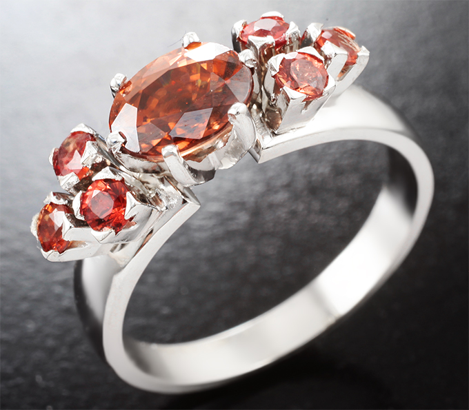 Вашему вниманию предлагается кольцо из белого золота 585 пробы c оранжевым цирконом высокой чистоты и сапфирами! Диаметр дополнительной инкрустации 2,5 мм. Площадка 19 х 7 мм, высота 6 мм. Вес изделия 5,21 г. Размер 18. Ниже приводятся ювелирные характеристики центральной вставки.