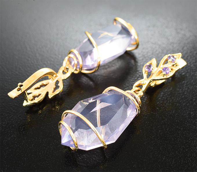 Вашему вниманию предлагаются серьги из желтого золота 585 пробы с лавандовыми аметистами авторской огранки и малыми аметистами! Диаметр дополнительной инкрустации 2 мм. Размеры серег с петлей 42 х 14 мм. Вес пары 9,34 г. Ниже приводятся ювелирные характеристики вставок.