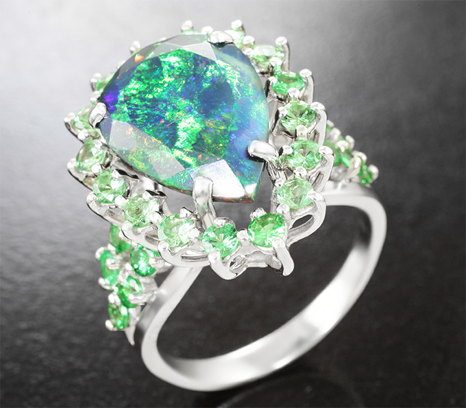 Кольцо с ограненным черным опалом 3,57 карата и цаворитами