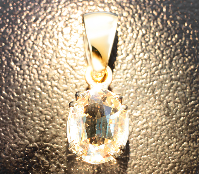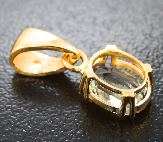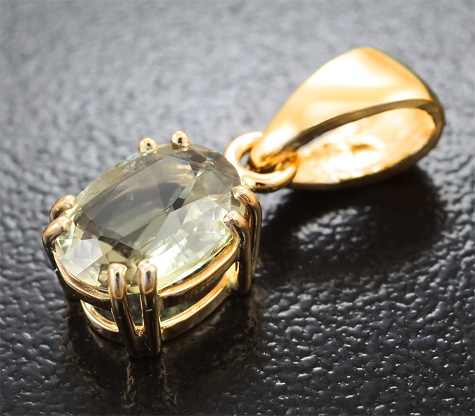 Вашему вниманию предлагается кулон из желтого золота 585 пробы с диаспором! При смене освещения, меняет цвет от желтовато-зеленого до оранжевого. Размеры кулона с петлей 19 х 7 мм. Вес изделия 1,27 г. Ниже приводятся ювелирные характеристики вставки.
