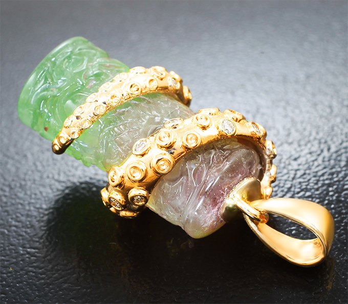 Золотой кулон с крупным арбузным турмалином 23,27 карата и бриллиантами