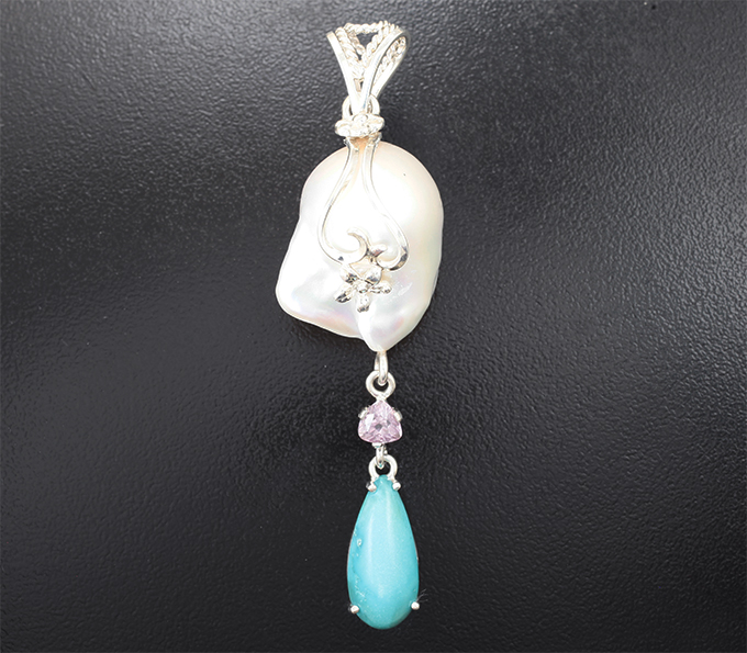 Кулон с кабошоном армянской бирюзы 4,58 карата, чистейшим розовато-пурпурным диаспором 0,7 карата и крупной морской жемчужиной барокко 36,78 карата