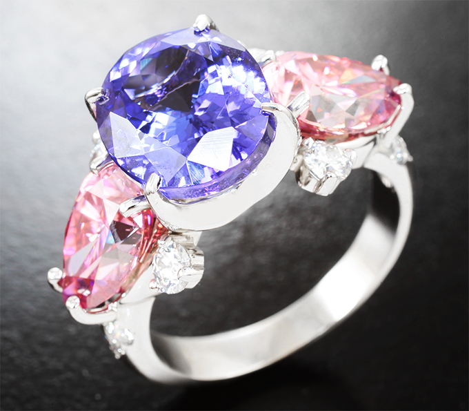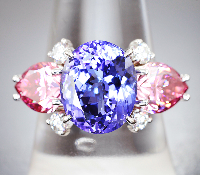 Кольцо с топовым танзанитом 6,46 карата, розовыми 3,92 карата и бесцветными муассанитами 0,6 карата