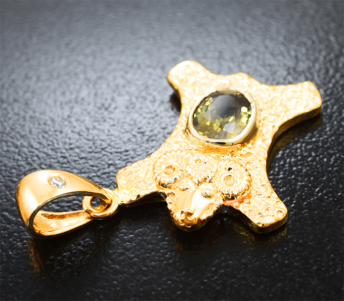 Вашему вниманию предлагается кулон из желтого золота 585 пробы с насыщенным синхалитом высокой чистоты и бриллиантом! Диаметр дополнительной инкрустации 1,5 мм Размеры кулона с петлей 28 х 15 мм. Вес изделия 4,86 г. Ниже приводятся ювелирные характеристики вставок.