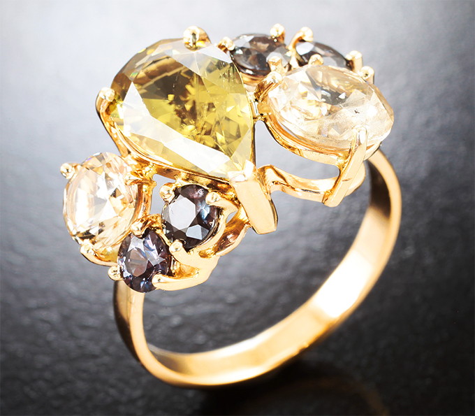 Кольцо с фенакитами 1,98 карата, синхалитом и сапфирами со сменой цвета