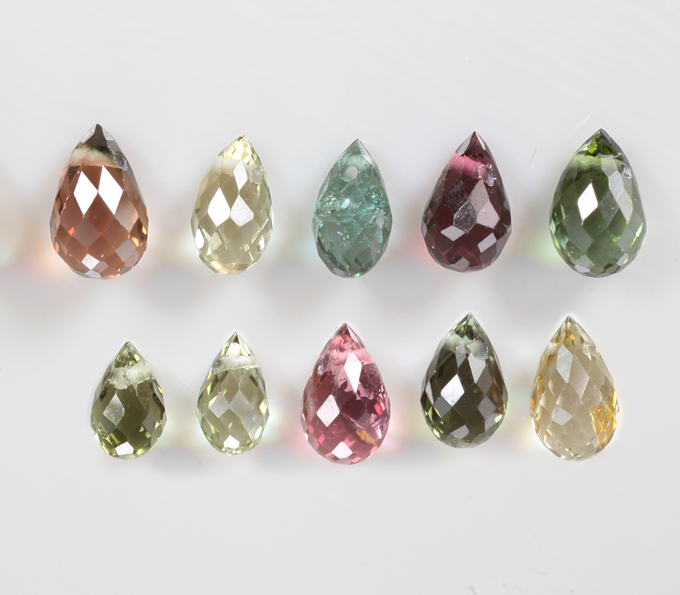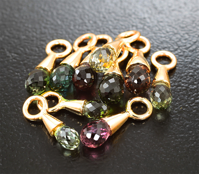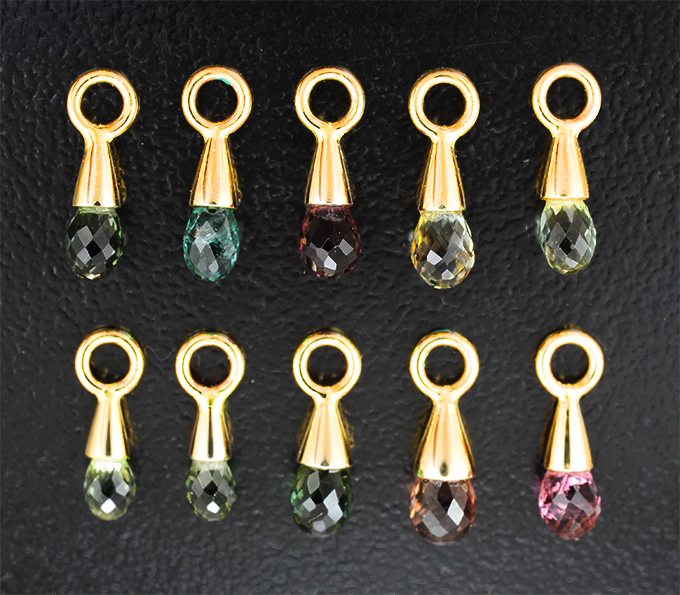 Вашему вниманию предлагаются 10 подвесов из желтого золота 585 пробы с разноцветными турмалинами! Размеры изделий 10 х 4 мм и 11 х 4 мм. Вес пары 2,36 г. Ниже приводятся ювелирные характеристики вставок.