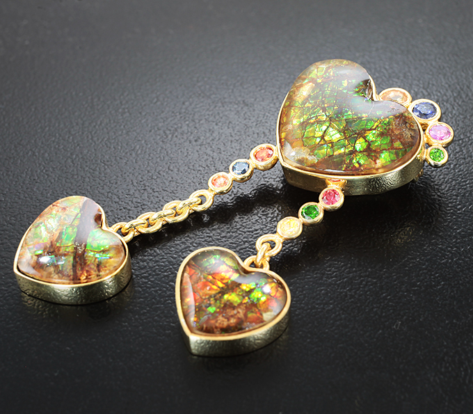 Брошь/кулон с аммолитами аммонитов, разноцветными сапфирами и цаворитами гранатами