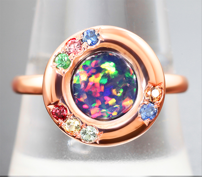 Кольцо с ограненным черным опалом 1,04 карата, сапфирами и цаворитами
