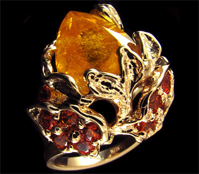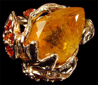 Вашему вниманию предлагается кольцо из желтого золота 585 пробы с солнечным клиногумитом и оранжевыми сапфирами! Диаметр сапфиров 2,6 мм. Ширина площадки 21 мм, высота 10 мм. Вес изделия 9,1 г. Размер 17,5. Ниже приводятся ювелирные характеристики вставки.