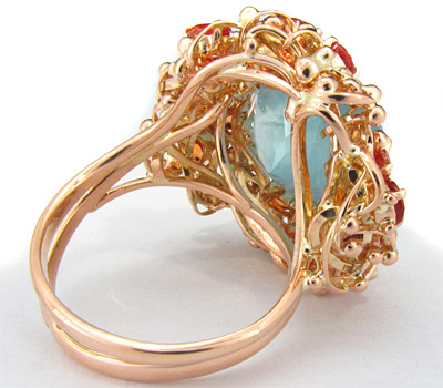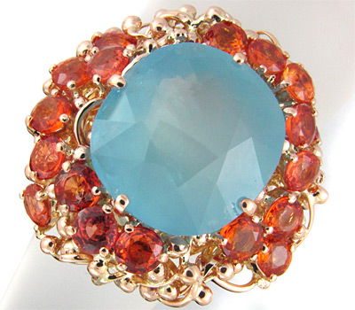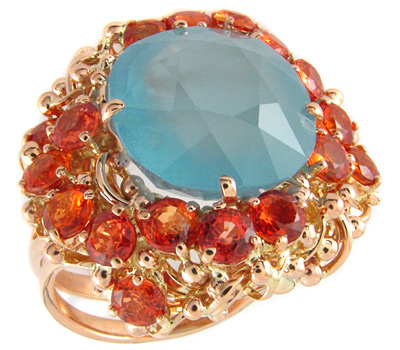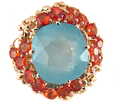 Кольцо с ярким аквамарином и оранжевыми сапфирами