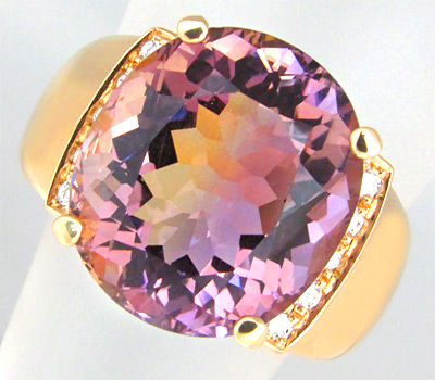 Вашему вниманию предлагается кольцо из золота 750 пробы с чистейшим эффектным аметрином и бриллиантами! Диаметр бриллиантов 1,3 мм, общий вес 0,16 карат. Ширина площадки 13 мм, высота 9 мм. Вес изделия 8,7 г. Размер 17,5. Ниже приводятся ювелирные характеристики аметрина.