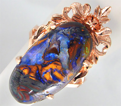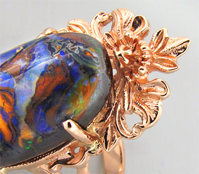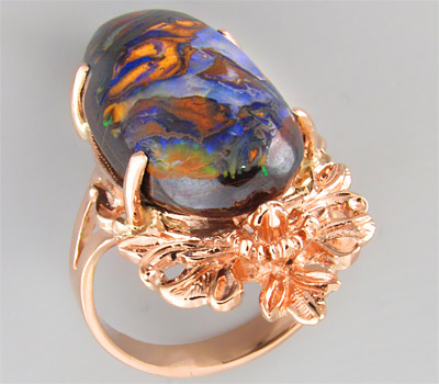 Вашему вниманию предлагается кольцо из золота 585 пробы с великолепным австралийским болдер опалом! Ширина площадки 32 мм, высота 8 мм. Вес изделия 8,5 г. Размер 18. Ниже приводятся ювелирные характеристики камня.