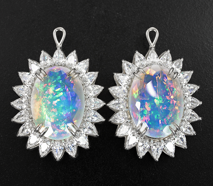 Вашему вниманию предлагаются подвесы для серег из белого золота 585 пробы с ограненными эфиопскими опалами и муассанитами! Основные цвета опалесценции: красный, желтый, зеленый, синий и фиолетовый. Размеры дополнительной инкрустации 5 х 3,1 х 1,8 мм. Размеры изделия 37 х 26 мм. Вес пары 18,76 г. Ниже приводятся ювелирные характеристики опалов.