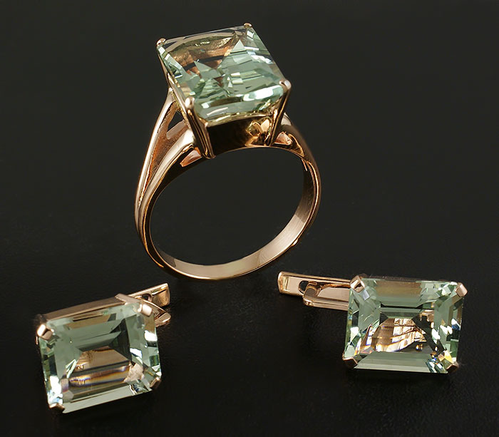Украшение выполнено на заказ и представлено на сайте в качестве примера выполненных работ. Описание: Вашему вниманию предлагается комплект (кольцо + серьги) из золота 585 пробы с зелеными аметистами! Вес комплекта 11,7 г. Кольцо: площадка 14 х 10 мм, высота 9 мм. Вес 5,3 г. Размер 18. Серьги: площадка 14 х 9 мм. Вес пары 6,4 г. Ниже приводятся ювелирные характеристики аметистов.