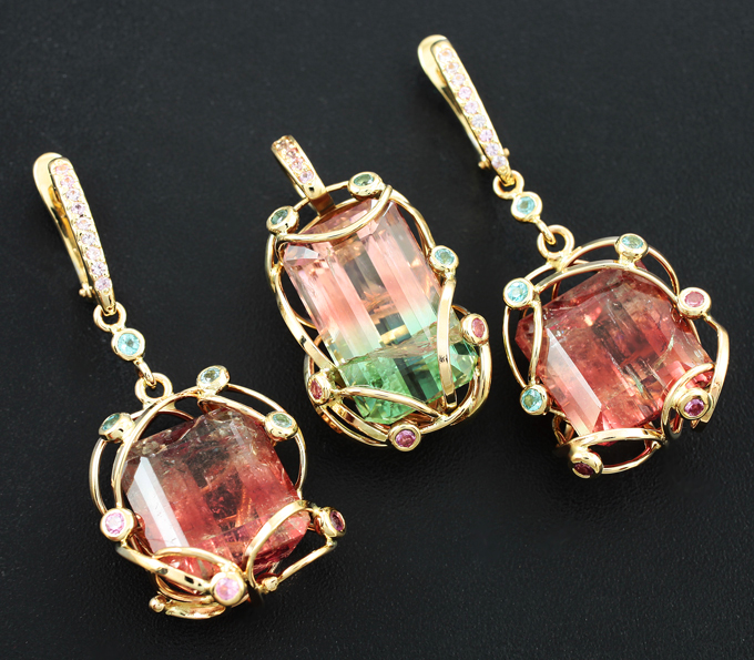 Украшение выполнено на заказ и представлено на сайте в качестве примера выполненных работ. Описание: Вашему вниманию предлагается комплект (серьги + кулон) из желтого золота 585 пробы с турмалинами, розовыми сапфирами и апатитами! Диаметр дополнительной инкрустации 1,25 мм и 2 мм. Вес комплекта 22 г. Серьги: размеры с петлей 45 х 19 мм. Вес пары 14,6 г. Кулон: размеры с петлей 32 х 17 мм. Вес 7,4 г. Ниже приводятся ювелирные характеристики турмалинов.