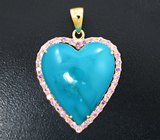 Украшение выполнено на заказ и представлено на сайте в качестве примера выполненных работ. Описание: Вашему вниманию предлагается комплект (серьги + кулон) из желтого золота 585 пробы с армянской бирюзой, амазонитами и розовыми сапфирами! Диаметр дополнительной инкрустации 1,5 мм и 2 мм. Вес комплекта 16,81 г. Серьги: площадка 16 х 16 мм. Вес пары 8,28 г. Кулон: размеры с петлей 40 х 27 мм. Вес 8,53 г. Ниже приводятся ювелирные характеристики вставок.