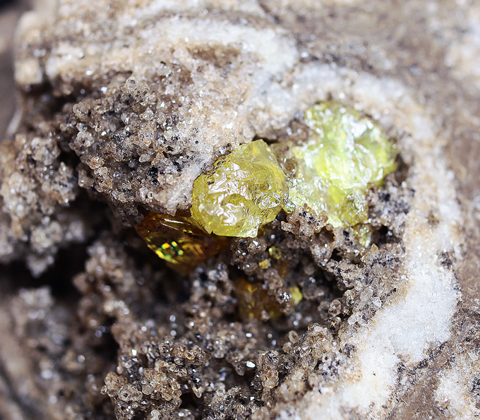 Кристаллы самородной серы на породе