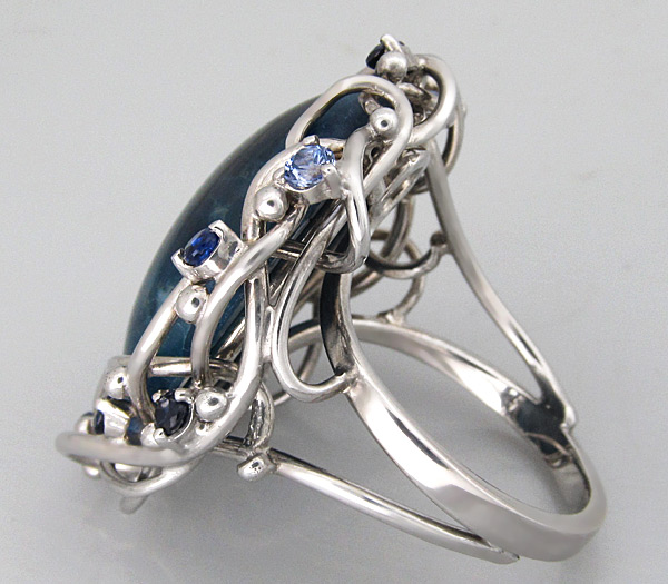 Кольцо с крупным кабошоном апатита и сапфирами