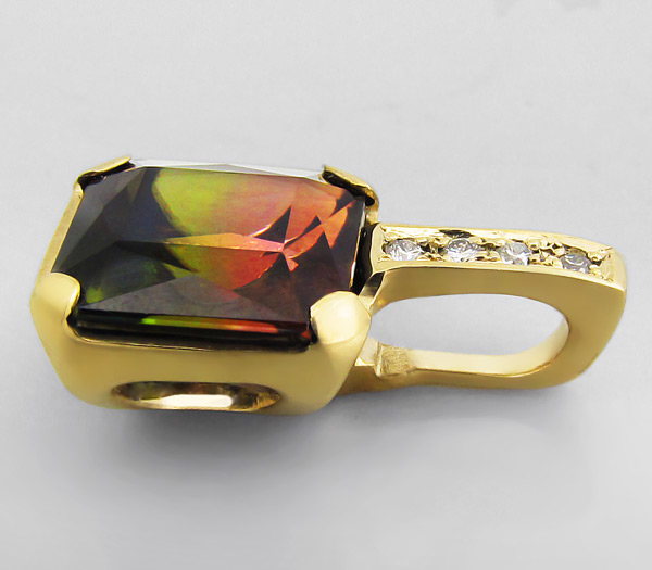 Вашему вниманию предлагается кулон из золота 750 пробы с арбузным турмалином и 4 бриллиантами! Диаметр бриллиантов 1,5 мм, общий вес 0,05 карата. Площадка кулона 20 х 10 мм. Вес изделия 3,5 г. Ниже приводятся ювелирные характеристики турмалина.