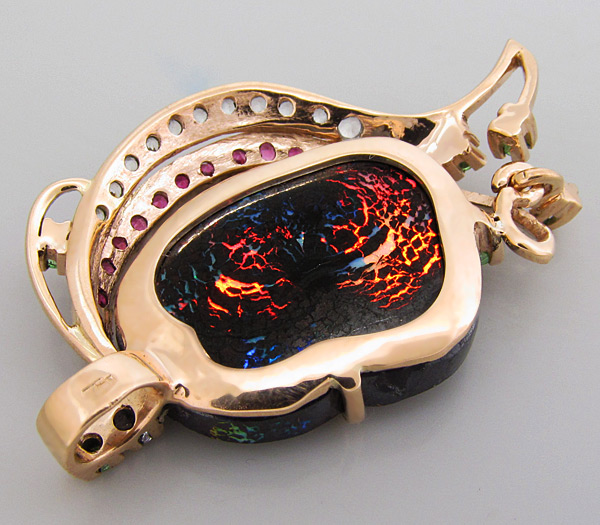 Вашему вниманию предлагается кулон из золота 585 пробы с фантастическим болдер опалом, цаворитами гранатами и разноцветными сапфирами! Диаметр цаворитов и сапфиров 2 мм. Площадка кулона 42 х 26 мм. Вес изделия 9,3 г. Ниже приводятся ювелирные характеристики опала.