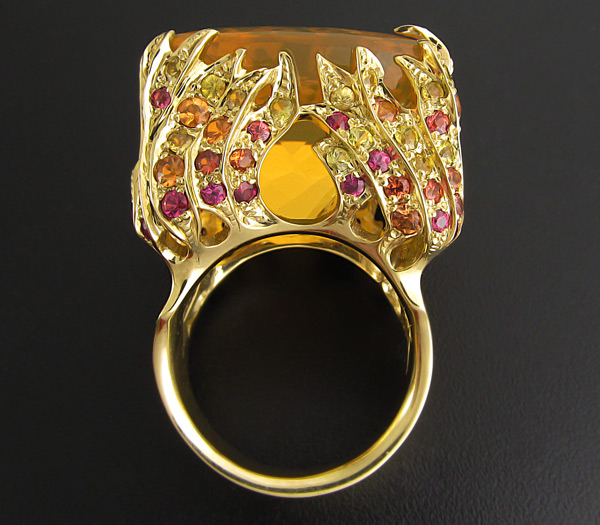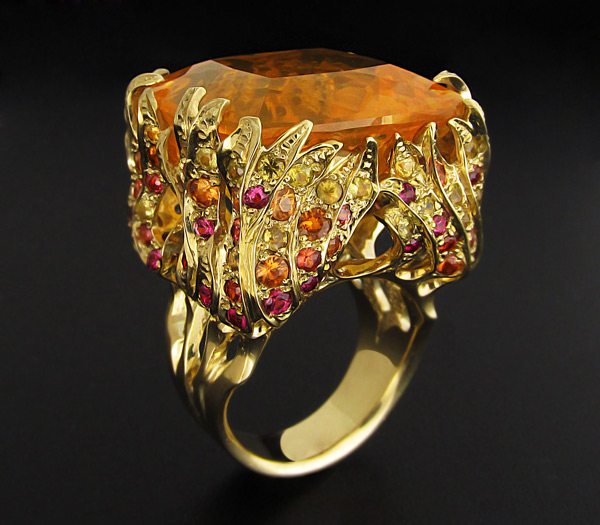 Кольцо с мексиканским огненным опалом и разноцветными сапфирами