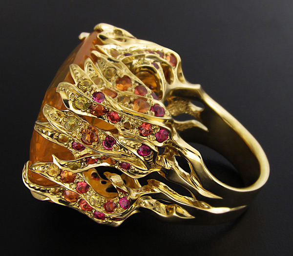 Вашему вниманию предлагается кольцо из золота 750 пробы с мексиканским огненным опалом и разноцветными сапфирами! Диаметр сапфиров 2 мм. Площадка 25 х 24 мм, высота 17 мм. Вес изделия 31,6 г. Размер 18,5. Ниже приводятся ювелирные характеристики опала.