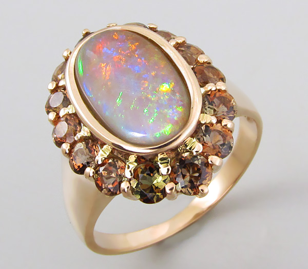 Вашему вниманию предлагается кольцо из золота 585 пробы с опалом и 11 андалузитами! Основные цвета опалесценции опала: красный/желтый/зеленый/синий. Размеры вставок 3 мм и 12 х 7 мм. Площадка 20 х 15 мм, высота 7 мм. Вес изделия 6,2 г. Размер 18,5.