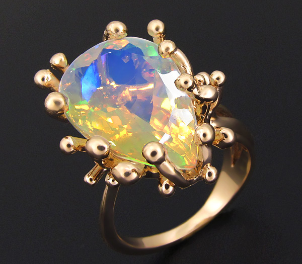 Вашему вниманию предлагается кольцо из золота 585 пробы с крупным ограненным эфиопским опалом! Площадка 19 х 15 мм, высота 9 мм. Вес изделия 5,9 г. Размер 15,5. Ниже приводятся ювелирные характеристики опала.