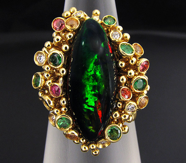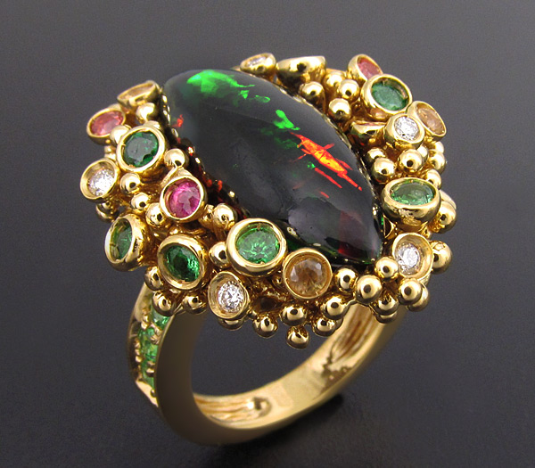 Кольцо с черным опалом, бриллиантами, цаворитами гранатами и разноцветными сапфирами