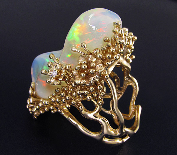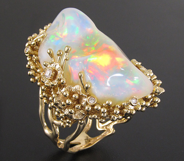 Вашему вниманию предлагается кольцо из золота 585 пробы с эфиопским опалом и бриллиантами (массой 0,1 карат)! Основные цвета опалесценции опала: зеленый/желтый/оранжевый/красный. Диаметр бриллианта 1,5 мм. Площадка 37 х 24 мм, высота 16 мм. Вес изделия 24 г. Размер 17. Ниже приводятся ювелирные характеристики опала.