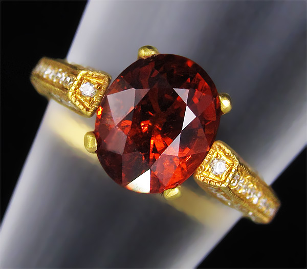 Вашему вниманию предлагается кольцо из золота 750 пробы со спессартином гранатом и бриллиантами (массой 0,3 карат)! Диаметр бриллиантов 1 мм. Площадка 18 х 8 мм, высота 9 мм. Вес изделия 2,3 г. Размер 16,25. Ниже приводятся ювелирные характеристики спессартина.