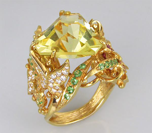 Кольцо с лимонным цитрином авторской огранки и самоцветами