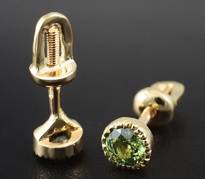 Вашему вниманию предлагаются серьги из золота 585 пробы с демантоидами гранатами! Диаметр пусет 5 мм. Вес пары 1,7 г. Ниже приводятся ювелирные характеристики гранатов.